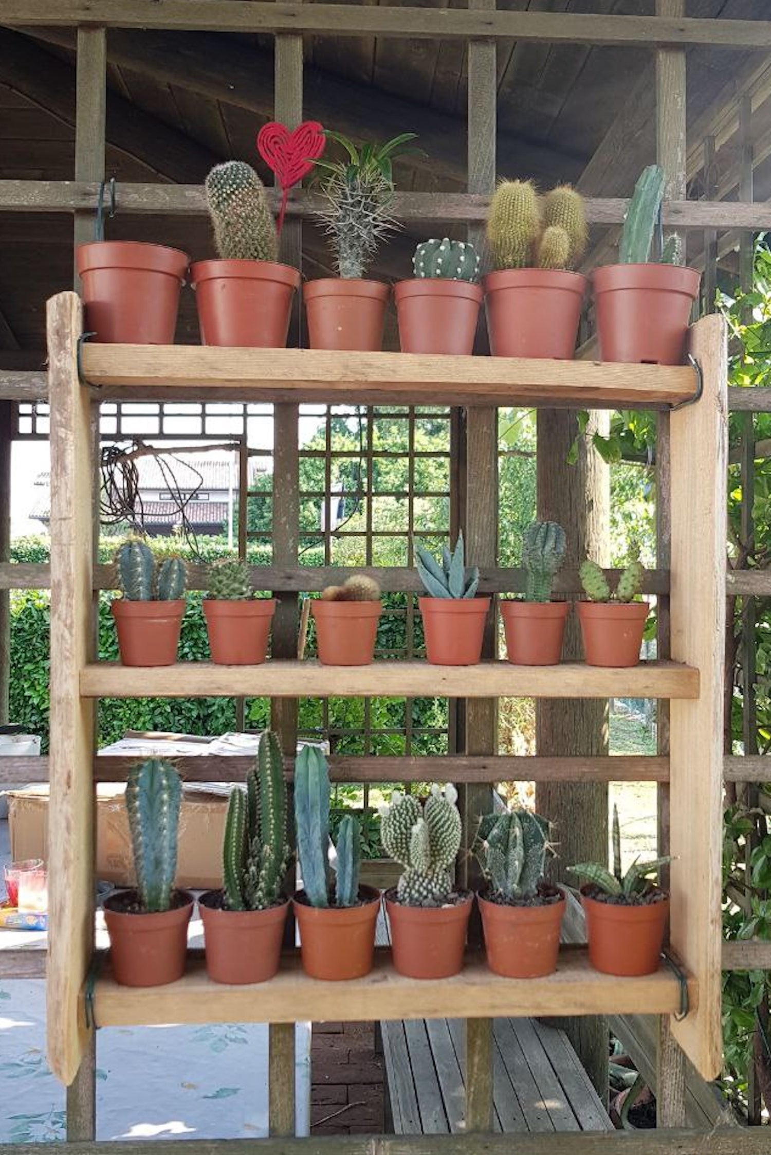 (Nella foto a sinistra la mia collezione di cactus nel 2018 in un supporto in legno realizzato da me)
