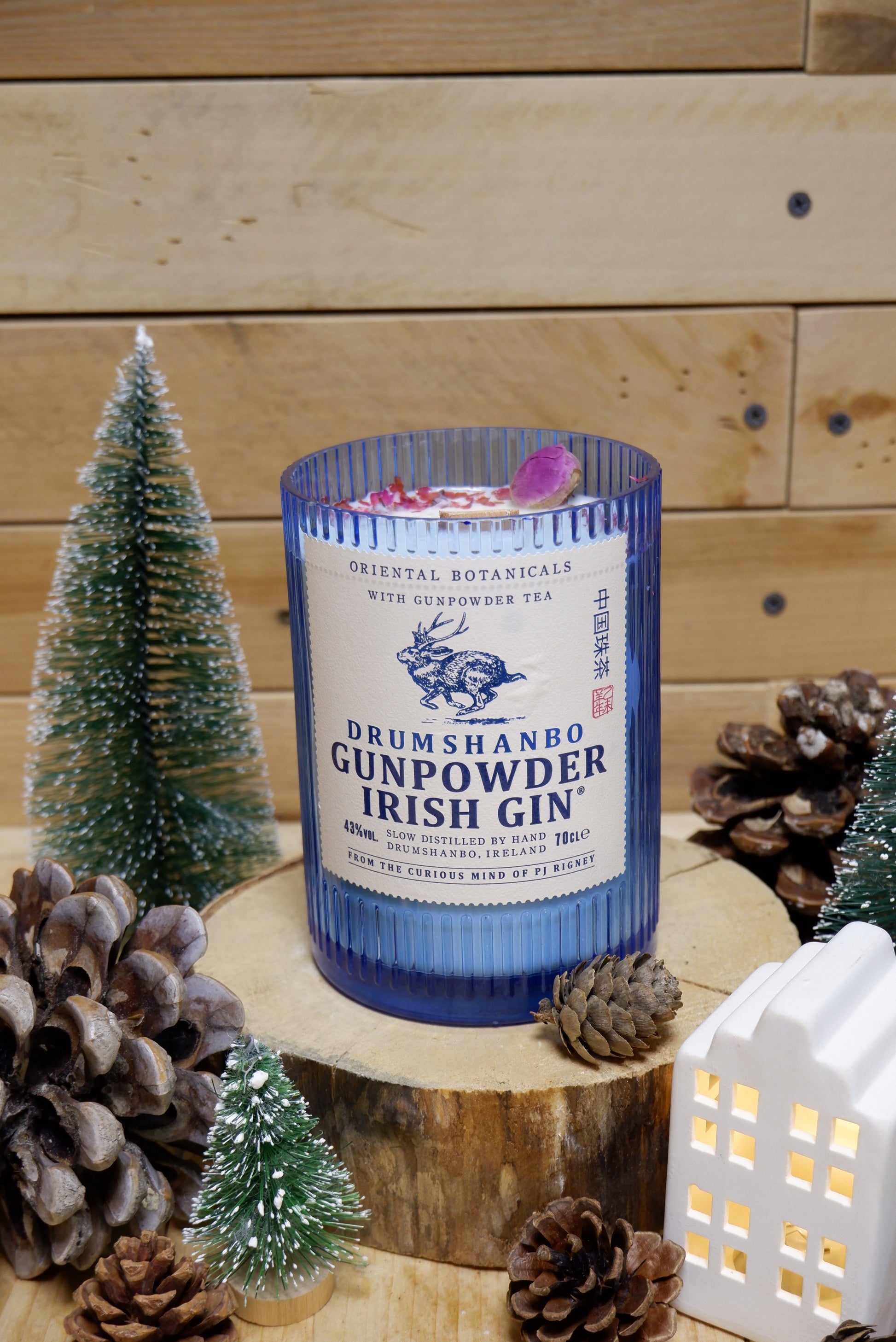 Candela di cera di soia realizzata all'interno di una bottiglia riciclata di Gunpowder da 700ml.