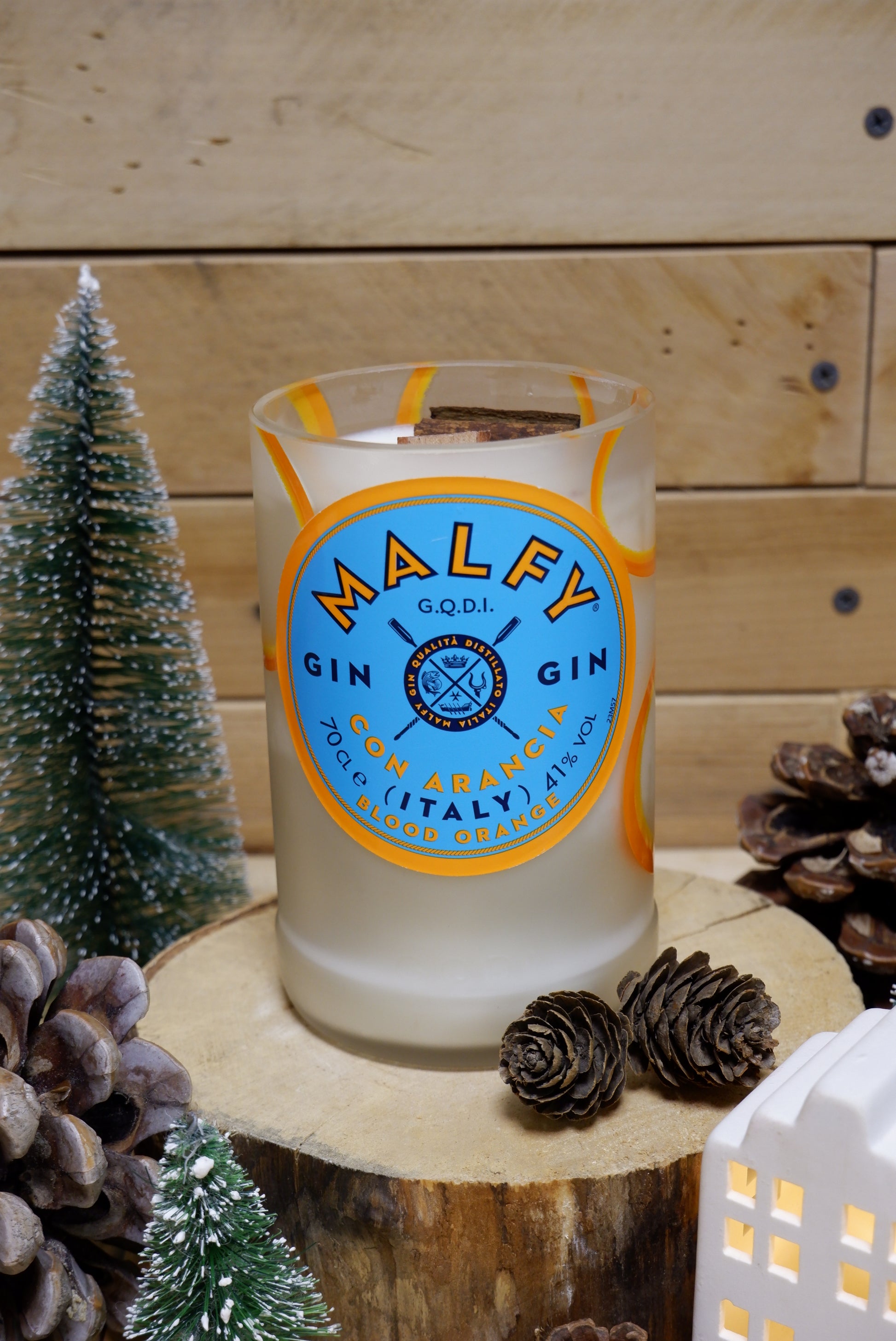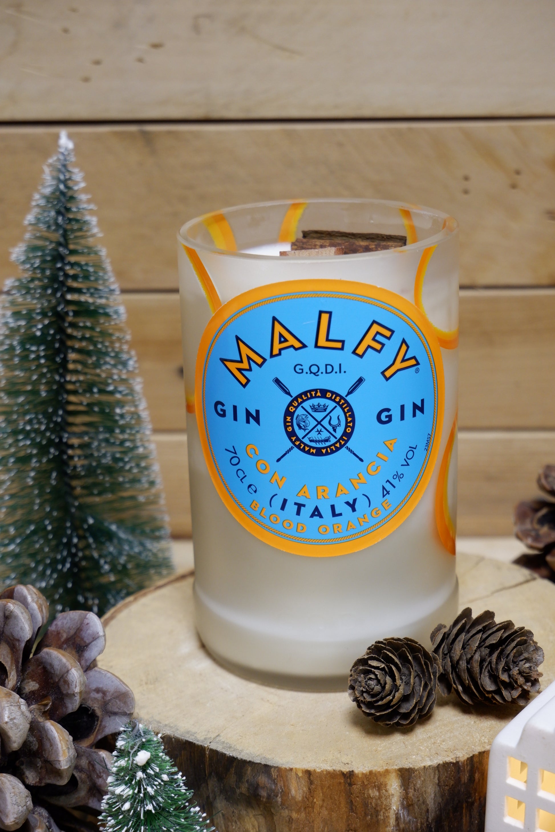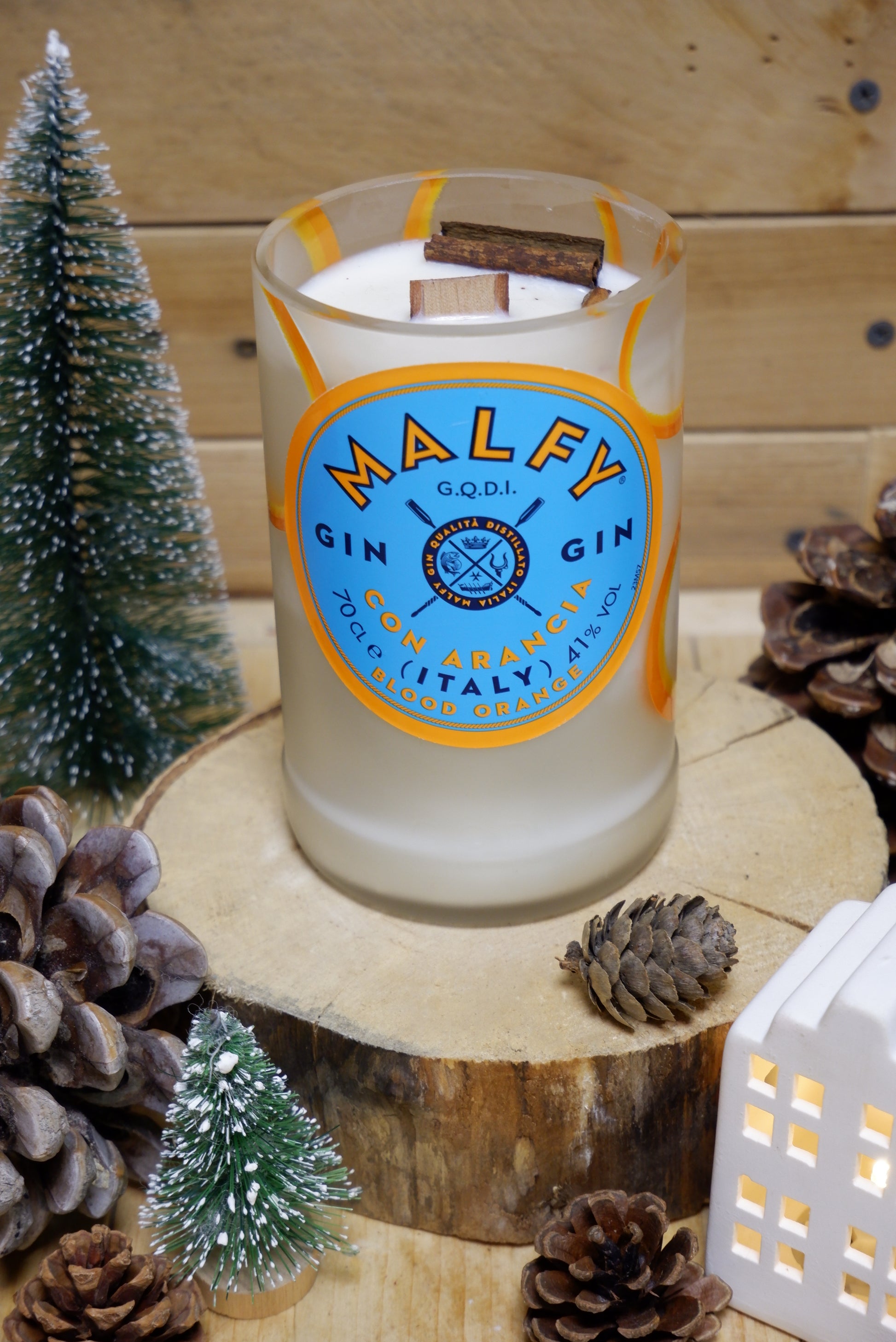 Candela di cera di soia realizzata all'interno di una bottiglia riciclata di Gin Malfy all'arancia da 700ml.