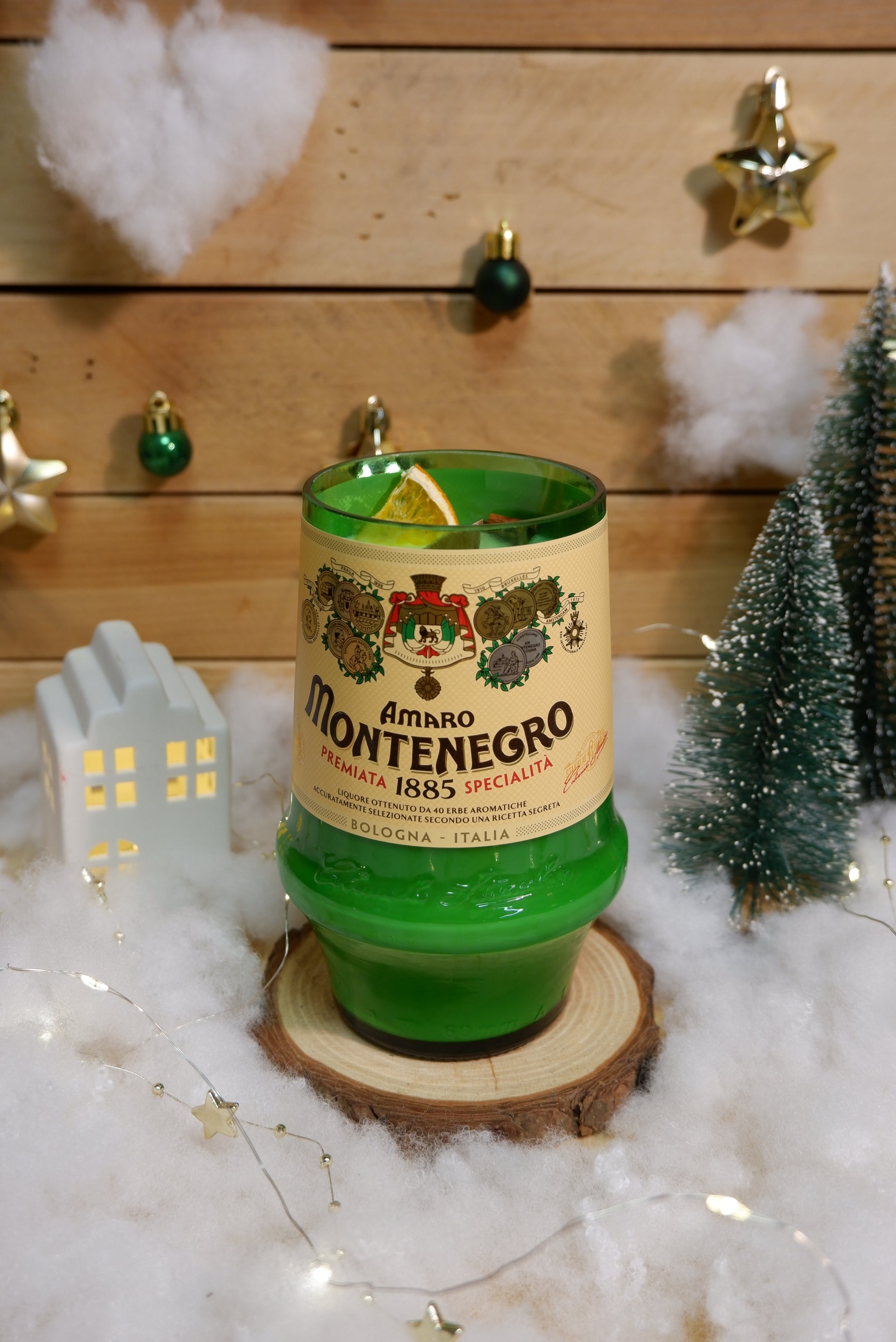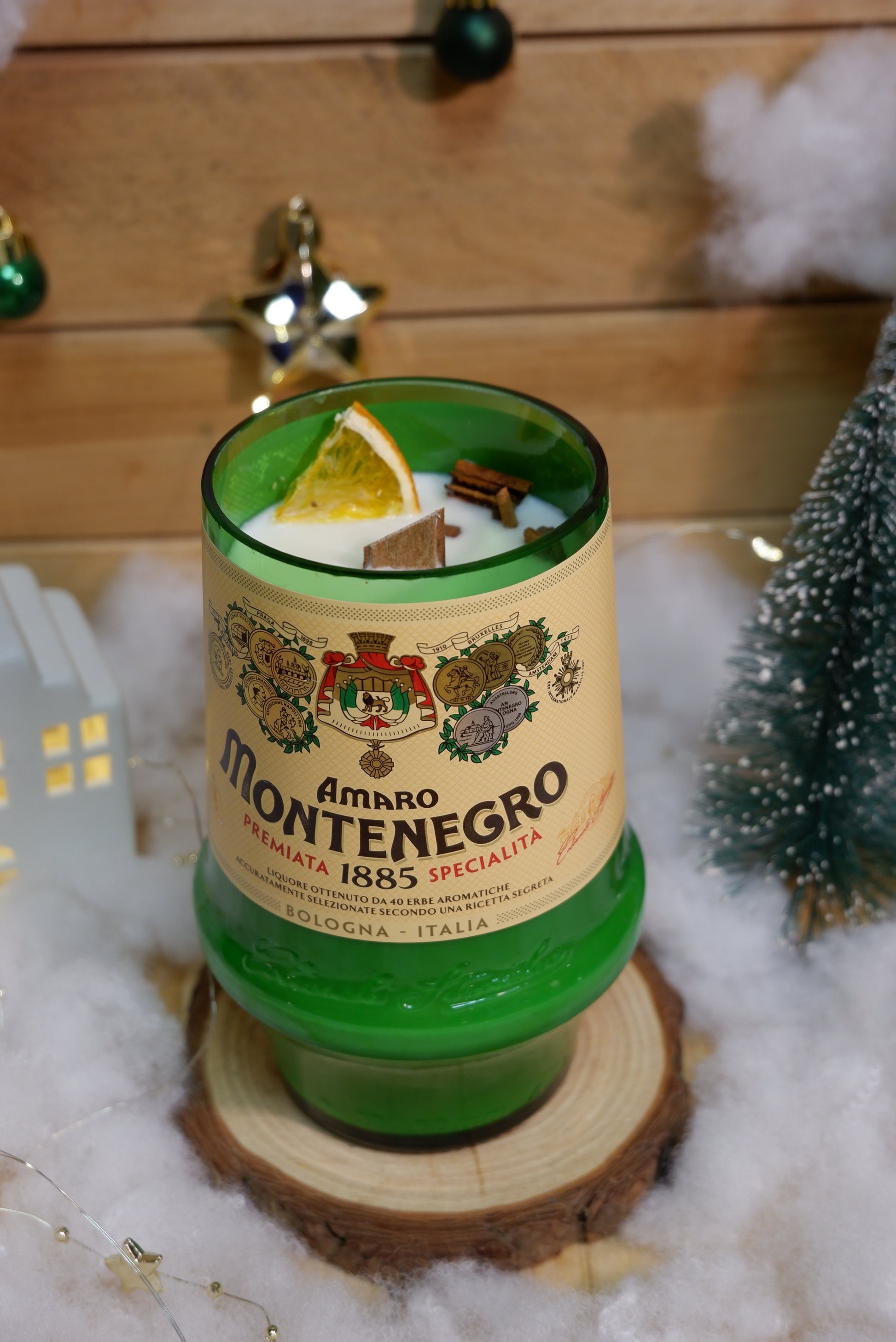 Candela di cera di soia realizzata all'interno di una bottiglia riciclata di Montenegro
